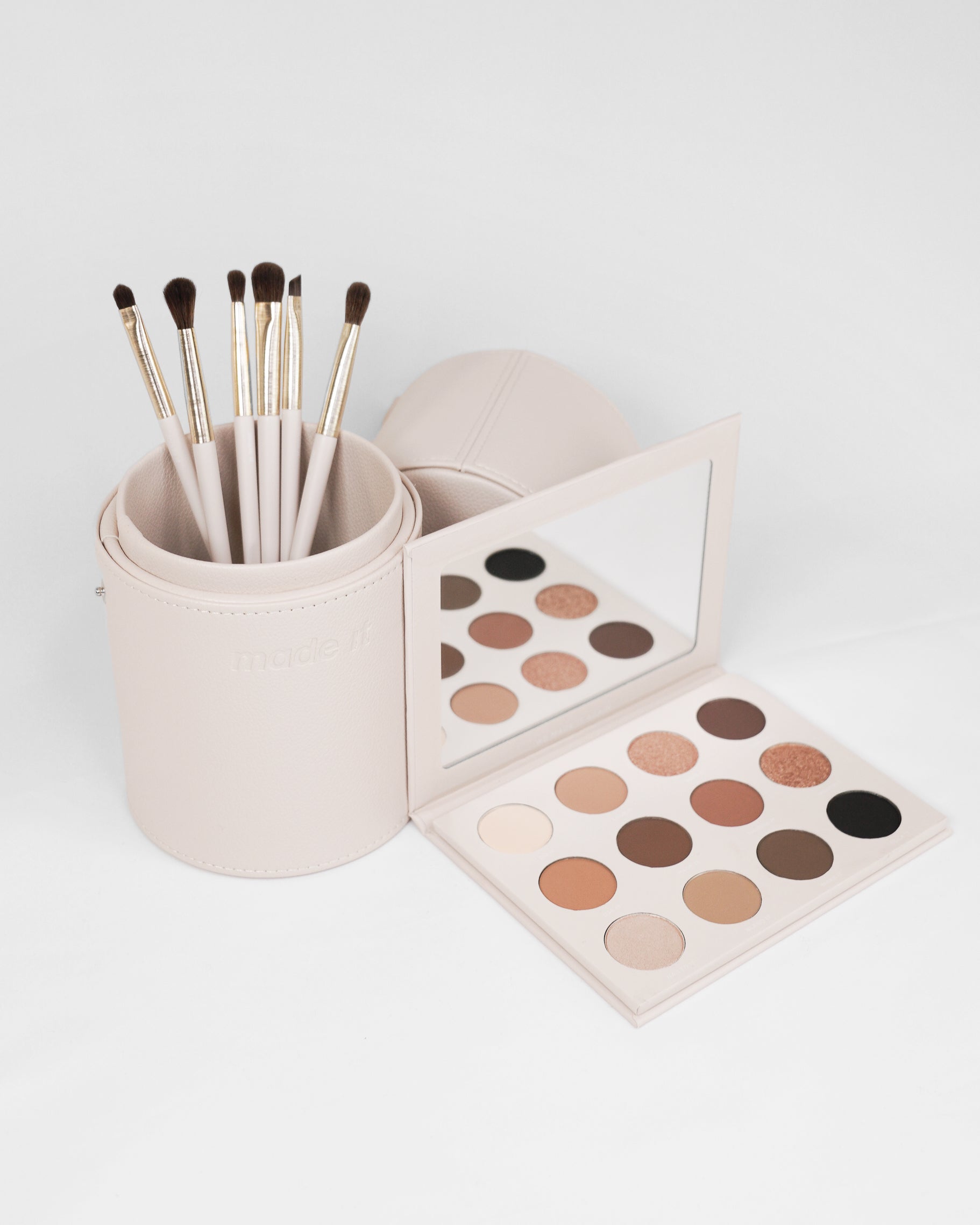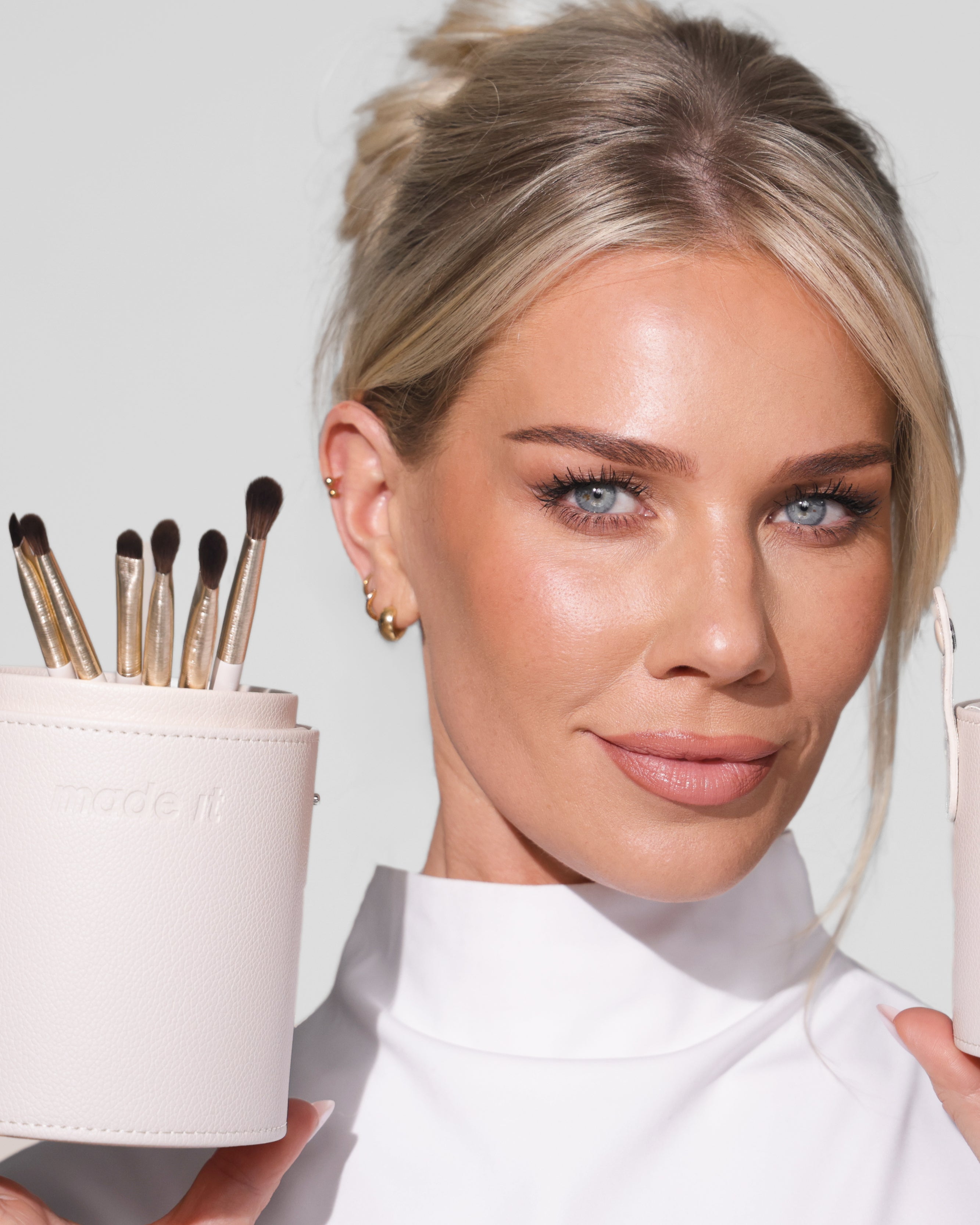 Made It Brush Kit består av seks essensielle øyenskyggekoster og vår nydelige brush case i høy kvalitet. For å minne deg på hvor viktig grep, trykk og teknikk er, har jeg laget en "grip-guide" på alle kostene, for å oppnå en flawless påføring. Kosteholderen passer perfekt til både oppbevaring og reise.